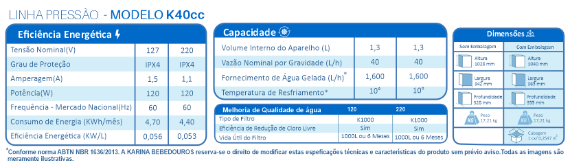 • Filtro de água com carvão ativado impregnado com prata: impede a proliferação de microorganismos, elimina sabor e odor de cloro e reduz a quantidade de cloro.